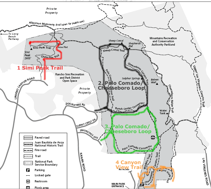Ranch Center Connector 1.1 miles, moderate to strenuous-This trail crosses a chaparral hillside and connects Cheeseboro and Palo Comado Canyons. Simi Peak Trail 0.8 mile, moderate-This trail winds from China Flat to Simi Peak, the highest point in the area. Enjoy a spectacular view of Oak Park, Agoura Hills and Simi Valley.